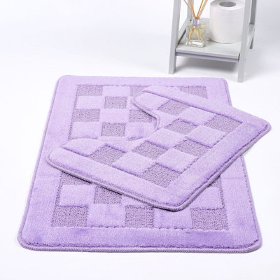 Bath Mat & Pedestal Set 2 Piece Squares Lilac Non Slip Bathroom Toilet
